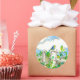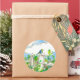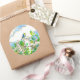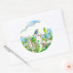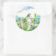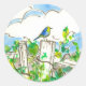 Un autocollant avec un petit bleuet coloré perché sur un poteau de clôture un jour nuageux avec des vignes et des brambles poussant sur la clôture dessinée à l'encre avec de l'aquarelle.