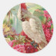 Une belle gravure d'art de l'époque victorienne d'un cockatoo aux roses roses roses, rouges et jaunes. L'arrière - plan est une scène tropicale avec des palmiers roses, une cascade et des montagnes dans l'arrière - plan. Belles couleurs pastel.