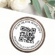 Autocollants ronds avec votre code QR et texte personnalisé dans une police serif élégante. Autour est un grain de bois brun, double bordure. Modifiez les polices et les couleurs de police, déplacez et redimensionnez les éléments à l'aide de l'outil de conception.