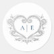 Des autocollants de mariage décoratifs en argent et bleu foncé sur un arrière - plan blanc. Ajoutez les initiales monographiques de vos couples. Idéal pour sceller des cadeaux et des faveurs lors d'un mariage d'hiver. Autres couleurs et articles mariages correspondants disponibles. © Design cardiaque original par Sarah Trett pour www.mylittleedenweddings.com sur Zazzle.