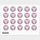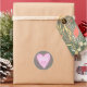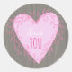 Design d'autocollant rond mignon avec un cœur rose et un cadre floral gribouillé sur un fond en bois. Le texte est entièrement personnalisable.