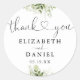 Élégant script de coeur floral vert merci autocollant personnalisé avec vos noms et date spéciale. Conçu par Thisisnotme©
