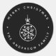 Ces autocollants de Noël tendance et élégants disent "Joyeux Noël" sur un arrière - plan noir, avec un ornement de Noël décoré de flocon de neige et de coeurs.
