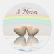 Autocollants avec mes illustrations originales de deux cœurs en bois flottant sur l'eau sous un arc-en-ciel. Texte personnalisable qui dit "5 Ans".