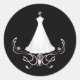 Joli autocollant d'enveloppe noire et blanche, avec une robe mariage blanche sur un stand et de jolies fleurs roses au fond. Super comme des phoques à vos enveloppes d'invitation de douche nuptiale.
