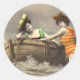 Photo vintage de deux femmes en maillot de bain. L'une est en vert et se trouve derrière un bateau en rangée. Le deuxième se trouve devant le bateau et est en costume rayé orange avec une grande ouverture à la jambe supérieure