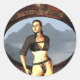 Petite comique vêtue, l'arrière - plan est une sorte d'écrin d'imaginaire/scifi avec une fenêtre elyptique et des montagnes enneigées.