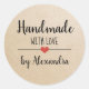 Autocollant moderne "fait main avec amour" avec une police noire sur un arrière - plan en carton agrémenté d'un coeur rouge mignon. Customiser du texte.