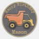 Ardoise en damier gris et un camion à benne jaune et orange qui travaille dur, autocollant d'anniversaire de construction pour les faveurs et la décoration. Personnalisez avec un nom ou un autre texte comme préféré.