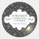 Élégant, noir et or cuisine de vacances étiquettes de cuisine - Noir avec l'or métallique look de neige flocons arrière - plan. Au centre se trouve un élégant emblème avec des bords et des courbes de charbon de bois. Lit 'Cookies de Noël fait maison' en lettrage élégant, qui peut être changé à n'importe quelle pâtisserie ou de la nourriture qui est votre spécialité de vacances. Nom personnalisé en dessous. Cliquez sur l'option Personnaliser pour modifier les couleurs, la taille et les styles de police du texte. Étiquettes de Noël en or festif pour des cadeaux de Noël comme la recette dans un bocal, la vente de gâteaux de vacances, la fête d'échange de biscuits, et autres festivités de la saison des fêtes. Pas seulement pour Noël, mais des autocollants de cuisson à thème hivernal pour toute la saison hivernale.
