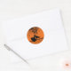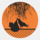 Des autocollants de baby shower amusants avec un corbeau tenant un bébé sur une clôture de maillage. Silhouette des arbres dans l'arrière - plan.