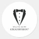 Rendre votre Mariage inoubliable - Ajoutez une touche personnelle avec un autocollant de proposition de toiletteur avec un costume de tuxedo noir et une illustration de cravate avant, avec un message de proposition dans une police serif classique.