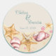 Autocollants de mariage avec coquillages colorés et texte que vous pouvez facilement mettre à jour avec vos spécifications en commençant par une jolie police et contour couleur aqua.