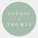 Cet autocollant mariage présente les noms du couple mariage en blanc contre une couleur arrière - plan modifiable ; pour passer du vert sauge à une couleur de votre choix, cliquez sur le bouton personnaliser. Personnalisez-le en remplaçant le texte de l'espace réservé. Pour plus d'options comme changer la police, sa taille et l'espacement entre les lettres cliquez sur le bouton "Personnaliser". *Veuillez noter que le filigrane Zazzle qui apparaît dans l'aperçu du zoom n'apparaîtra PAS sur le produit imprimé final. © Bois de rose et agrumes