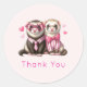 stickers Merci avec une jolie illustration. Une paire de loutres en vêtements rose. Portant des chemises rayées, l'une portant une cravate et l'autre portant un arc. Entouré de coeurs d'amour.