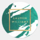Des coups de pinceau de peinture verte émeraude créent un fond abstrait sur ce design d'autocollant personnalisé. Votre nom ou le nom de votre entreprise est affiché dans une boîte en faux or pour une esthétique moderne. Ces autocollants sont parfaits pour sceller des enveloppes ou des colis, pour les utiliser comme étiquettes de produits ou de bougies, ou pour personnaliser des fournitures de bureau. Art et design © 1201AM Design Studio | www.1201am.com