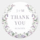Découvrez le charme de nos délicats autocollants ronds de remerciement de mariage bohème, avec une couronne enchanteresse de fleurs fleurs sauvages pourpres aquarelles ornées du monogramme de la mariée et du marié dans un script de calligraphie minimaliste simple. Parfaits pour les fêtes de jardin extérieur du printemps ou de l'été, ces autocollants ajoutent une touche d'élégance à votre décor d'événement.