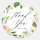 Autocollant Merci féminin et romantique représentant une couronne de fleurs rose pêche aquarelle. L'autocollant Merci féminin est entièrement personnalisable pour tout événement. Parfait comme touche finale pour les cartes et les faveurs de fête.
