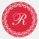 Un autocollant rouge avec une bordure de couronne de laurier blanche et un monogramme personnalisé que vous pouvez modifier avec votre propre monogramme. Pour changer la police ou déplacer l'initiale pour la recentrer, choisissez le bouton "personnaliser".