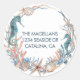 Les autocollants d'adresse de retour sur le thème "Sous l'océan" présentent une couronne aquarelle avec du corail, un hippocampe, une étoile de mer, des coquillages et des algues dans des tons bleus et beige côtier.