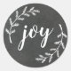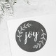 Sceaux d'enveloppe de Noël et autocollants cadeaux personnalisés avec la mention "joie" en écriture manuscrite avec des branches de pin blanches sur fond de style tableau noir.