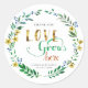 Couronne florale aquarelle dessinée à la main avec marguerite jaune et petites fleurs et feuilles bleues, avec le message "L'amour grandit ici" parfait pour les autocollants de produits, les autocollants de cadeaux de mariage, les autocollants de douche de mariée, les autocollants d'annonce de grossesse, les autocollants d'anniversaire de bébé. Le message "Merci", les noms et la date peuvent être facilement modifiés et personnalisés.