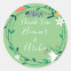 Couronne florale de mariage remerciement, autocollant rond classique représentant une couronne florale moderne de fleurs printanières sur fond vert luxuriant. Cet autocollant de faveur de mariage chic botanique peut être personnalisé avec vos noms. Conçu par Thisisnotme©