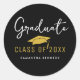 Célébrez votre diplômé avec style grâce à cet autocollant de fin d'études en noir et or moderne, avec une écriture élégante "Diplômé", une illustration élégante d'un couvre-ceremonial de fin d'études et un texte personnalisable pour le nom du diplômé, l'école et l'année de promotion. Parfait pour sceller les invitations, décorer les faveurs ou ajouter une touche personnelle à la décoration de la fête. Un design chic et intemporel pour toute célébration de fin d'études secondaires ou universitaires.