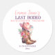 Un autocollant Cowgirl Last Rodeo Bachelorette charmant avec des bottes de cowgirl, des fleurs et un chapeau de cowgirl rose. Un grand design pour une fête de thème western, une douche de mariage. Le texte en rose pâle et violet peut être modifié pour personnaliser vos détails de fête, puis personnaliser avec votre nom et vos dates.