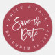 Chic et moderne enregistrer la date autocollants sont les noms et la date mariage dans le texte circulaire entourant "enregistrer la date" dans la typographie de brosse en lettres blanches. L'arrière - plan rouge de canneberge riche est frappant et élégant pour une façon parfaite de terminer votre enregistrement des mailings de date, en particulier pour les mariages d'hiver, de vacances ou de Noël.