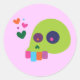 Cette illustration de crâne coloré et funky présente un mignon crâne de dessin animé vert avec des coeurs flottants et des dents rose, orange, violet et bleu ! Cette illustration d'art vectoriel indie est le cadeau parfait à acheter pour toute personne ayant l'amour pour une oeuvre d'art éffrayante mignonne et légèrement sombre mais brillante et vibrante!