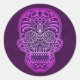 Un design élaboré du crâne à sucre Day of the Dead décoré de tourbillons complexes et de motifs à points. Les lignes et les cercles complexes sont colorés d'un violet clair qui est mis en surbrillance pour créer une brillance subtile sur la surface. L'intérieur du crâne est fini avec un violet profond qui est répété dans l'arrière - plan créant un beau contraste. Une ombre tombe juste sous le crâne, ce qui donne l'impression de flotter juste au-dessus de la surface de l'autocollant. Ce design élégant est une représentation frappante de ce symbole du Jour des Morts.