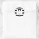 Crânes modernes et bandes blanches noires violet mariage d'Halloween Enregistrer l'autocollant Date. Il affiche un motif rayé noir et blanc, un cercle blanc au centre avec votre texte et un couple crânien amusant en violet et noir la mariée avec un arc, le marié avec un casquette.