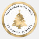 Bordure dorée et sapin de Noël Fabriqué avec amour Cadeau de Noël personnalisé Autocollant rond classique... Créez-vous des vêtements, des ornements ou des accessoires faits main pour les cadeaux de fêtes cette année ? Notre autocollant/étiquette de cadeau de fête affiche une bordure élégante en feuille d'or autour du texte : "Fabriqué avec amour" et "par Votre Nom". Au centre se trouve un sapin de Noël en feuille d'or qui s'accorde avec la bordure en feuille. Vous pouvez facilement modifier votre nom et le nom du produit sur le modèle de personnalisation.