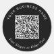 Autocollant rond noir promotionnel moderne pour votre entreprise ou organisation. Entrez l'adresse URL de votre site Web pour créer facilement votre propre code QR numérisable, et ajoutez deux lignes de texte blanc, comme votre nom d'entreprise et votre slogan.