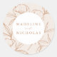 Élégants autocollants de mariage fleuris avec vos noms en terre cuite marron avec un arrière - plan d'art floral contre un arrière - plan crème moucheté. Des autocollants de mariage personnalisés parfaits pour les scellés d'enveloppe et pour sceller les sacs de faveur de mariage. Conçu pour coordonner avec notre collection de mariages floraux botaniques modernes.