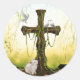 Croix vide avec vignes qui poussent dessus après la résurrection de Pâques avec un arrière - plan de l'aube brillant et les créatures de Dieu l'inspecter autocollant de Pâques