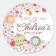 Un joli cupcake, un biscuit et des fleurs de style doodle sur cet autocollant "de la cuisine de" ou "fait maison par" pour un boulanger, un biz à la maison, une boulangerie ou un chef pâtissier, personnalisé avec votre texte et votre schéma de couleurs, parfait pour donner ou vendre des produits de boulangerie.