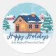 Ce bel autocollant cadeau de fête de vacances immobilier personnalisé est parfait pour une entreprise immobilière située au nord. Un beau dessin d'une maison bordée de neige et de fumée sortant de la cheminée à côté des arbres verts. Un courtier peut garder Happy Holidays en écriture cursive ou customiser avec ses propres Joyeuses Fêtes pour Noël.