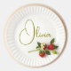 A strawberry branch with flowers, berries, and green leaves rests on a plate with the name Olivia. The name can easily be changed.