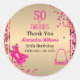 Pour la fête d'anniversaire de la fashionista de 50 ans merci Sticker Rond. Fabulous script hot rose fuchsia sur blouson or doré féminin faux confetti rose chaud, belle une paire de talons hauts avec des arcs est assis dans le coin gauche et un mignon et coloré sac à main rose doré 👛 (sac à main) assis dans le coin inférieur droit,50 et Fabulous script chaud fuchsia rose sur feuille métallique faux or. Vous pouvez facilement modifier votre nom, vos polices, votre couleur, votre taille et votre numéro d'âge en cliquant sur les options de personnalisation de Zazzle.