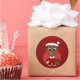 Round stickers with an illustration of a cute smiling African American boy with short black hair, the boy is wearing a Santa Claus costume with a red hat and holding a present; in a red circle on a red background, a Christmas holidays design