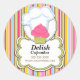 © 2010 Socialite Designs. Conception de l'autocollant de cupcake lunaire. L'image comprend un cupcake, un casquette de boulanger, une bannière de texte fantaisiste et un arrière - plan rayé coloré. Il suffit de remplacer notre texte modèle par le vôtre. Une façon merveilleuse de sceller vos boîtes de boulangerie
