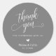 Modern Wedding Minimalist Thank You Gifts Classic favor Round Sticker, in classy script, cute little heart, with bride and groom name and wedding date, in dark grey theme.