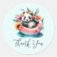 stickers Merci avec une adorable image estivale. Une aquarelle avec un panda noir et blanc assis dans une bague de baignade dans l'eau. Entouré de jolis fleurs sauvages. Un ours totalement froid.