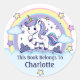 Autocollant adorable à la plaque avec un dessin animé mignon de licorne. Elle a une crinière et une queue colorées en bleu pastel, rose et violet, une corne jaune sur la couronne de sa tête, un corps blanc et des sabots pourpres. Elle est debout sur l'herbe violette avec des buissons pourpres dans l'arrière - plan et entourée d'étoiles colorées, un bel arc-en-ciel et des nuages moelleux. Vous trouverez ci-dessous un modèle pour ajouter votre nom.