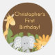 Commencez votre fête d'anniversaire dans la jungle de safari avec nos adorables autocollants de fête d'anniversaire animaux de safari. Nos autocollants de remerciement ont un lion et un éléphant de girafe sur un arrière - plan marron avec des feuilles de jungle. Visitez notre boutique pour obtenir des cartes de remerciements, des invitations à l'anniversaire, des autocollants de remerciement et des timbres-poste assortis. © Clementine