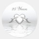 Autocollants ronds avec mon illustration de deux dauphins et un cœur argenté sur des eaux scintillantes. Texte personnalisable indiquant "25 Ans".