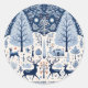 Une belle illustration d'une scène boisée avec cerfs, arbres et animaux dans une palette de couleurs bleues, des oeuvres d'art d'inspiration scandinave, des motifs de feuillage détaillés, des motifs nordiques traditionnels, et une maison en bois rustique visible dans l'arrière - plan. Une bordure décorative se forme autour de tous les éléments. Le design comprend des caractéristiques telles que des bois de cerf, des fleurs sauvages, des feuilles, des lucioles, des étoiles et des empreintes d'animaux. Un beau design pour toutes vos festivités de Noël !
