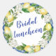 Conçu pour s'harmoniser avec la collection de citron de Jenny, cet autocollant nuptial à lunchon présente une couronne jaune citron et une couronne blanche à fleurs. Un soupçon de carreaux bleus autour du bord de l'autocollant rond. Le nom de la mariée et le déjeuner de la mariée sont écrits dans une police de caractères moderne et tendance. La date complète le texte. Un petit coeur jaune apporte une touche de romantisme. Tout le texte est modifiable.